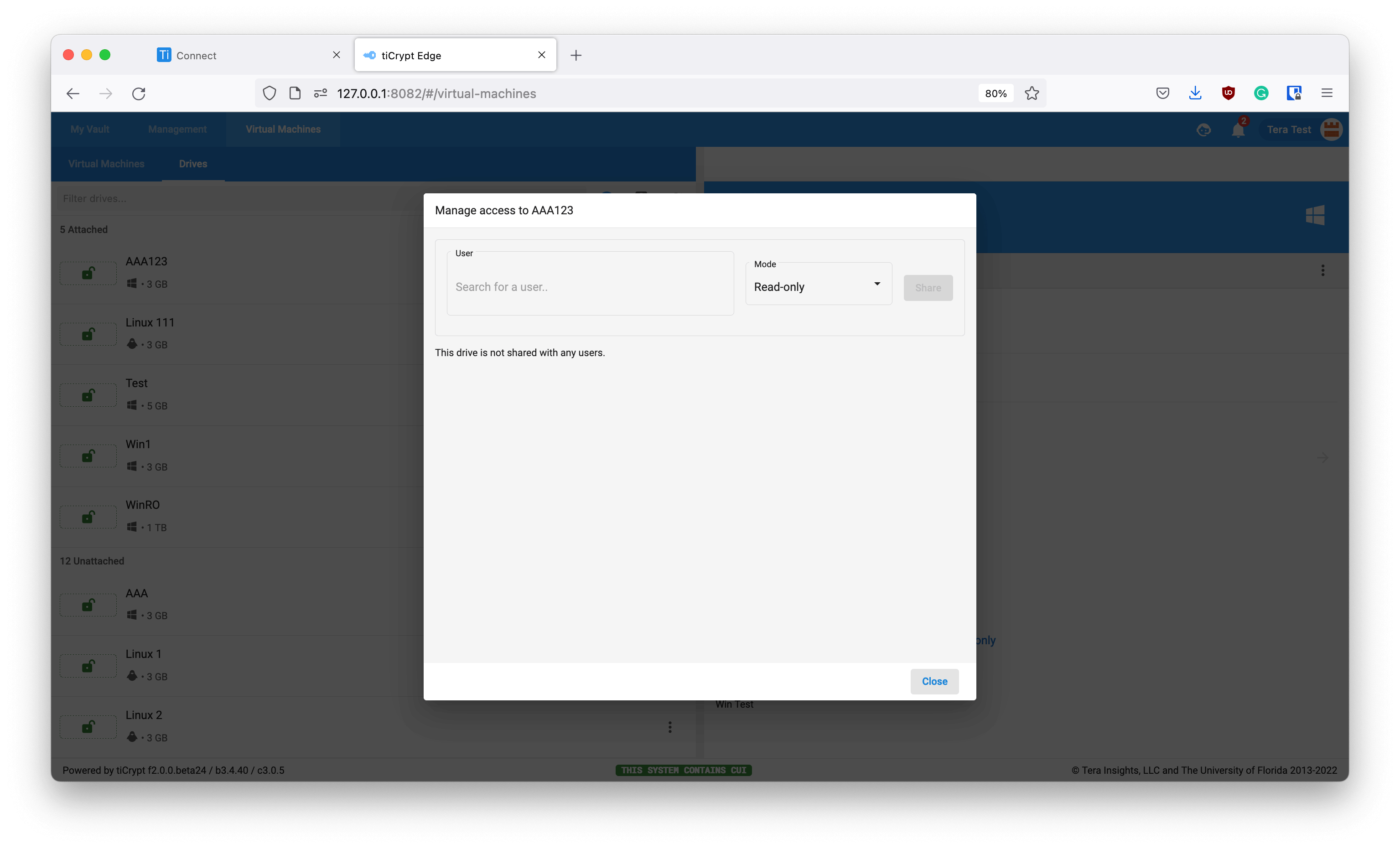 tiCrypt FeaturesAdmin AccountAdmin Action ModalsDrive SharingOn this pageDrive SharingInformationThis allows you view drives shared with you including creator, creation date, drive format, capacity, and the team associated with the drive.AccessViewing drivesNavigate to the Management tab along the top of the page.Select the Drives icon in the navigation pane.ExampleShare Drive