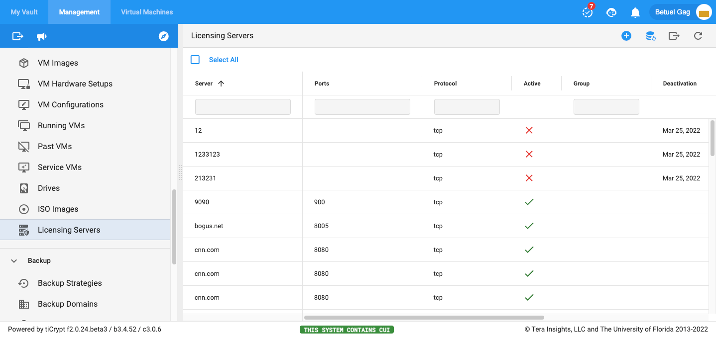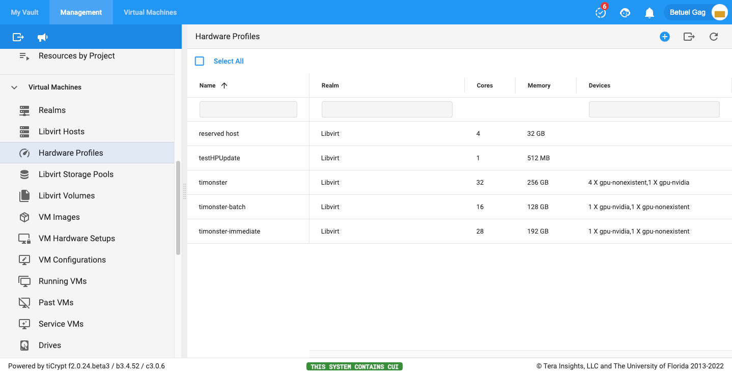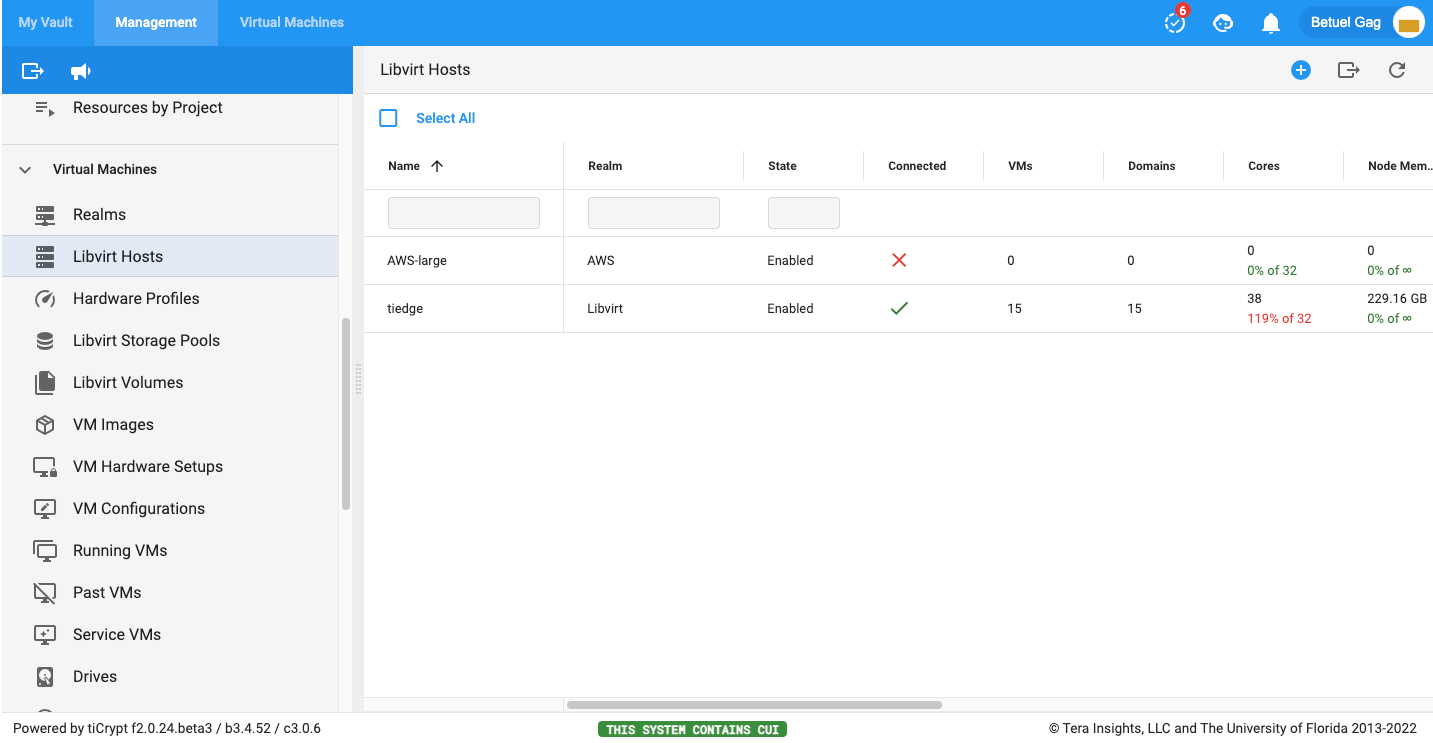 Realms, also known as hypervisors, which is a specific type of computer software that is used to create and run virtual machines. These realms can only be managed in the configuration files. Users can view the Realms that exist in the system through the "Realms" tab in management. Each Realm is associated with a Driver. The purpose of this driver is to let the backend system know HOW to communicate with the infrastructure. Realms do NOT connect to other realms. Users of tiCrypt cannot create their own realms.