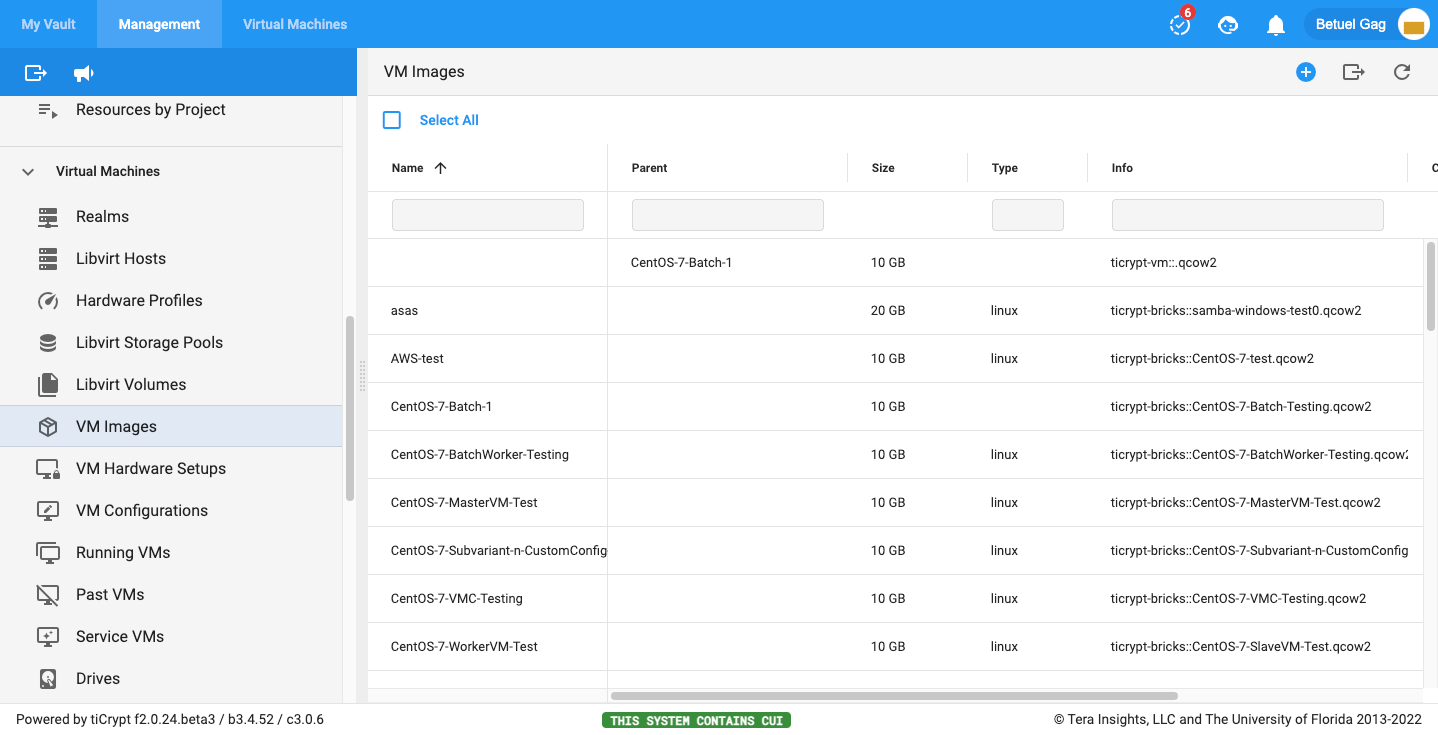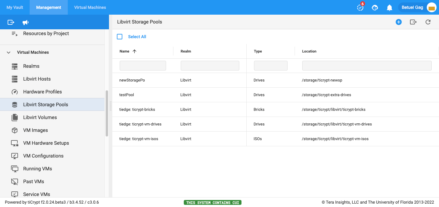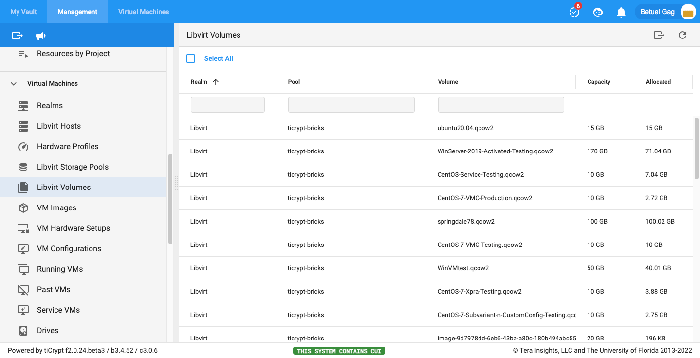 Libvirt Volumes are essentially the "disk" where the operating system lives. Users cannot populate the volume tab through tiCrypt. Rather, the system backend communicates with the host and requests all of the volumes that have been integrated into the system.
