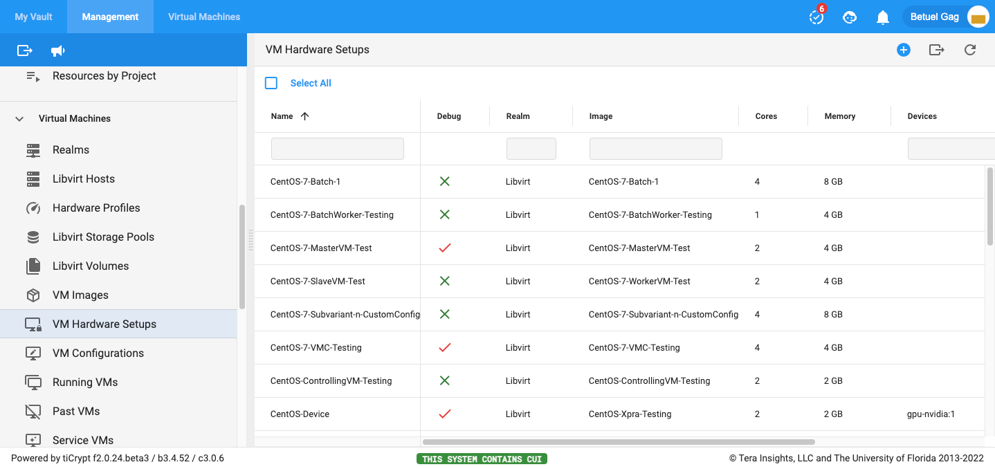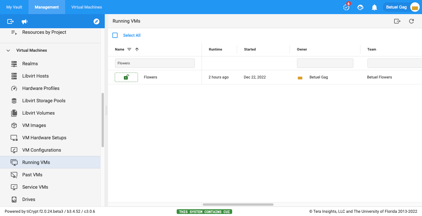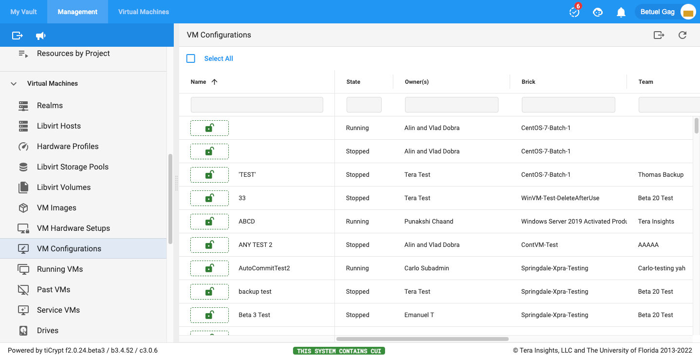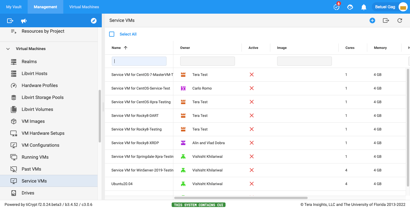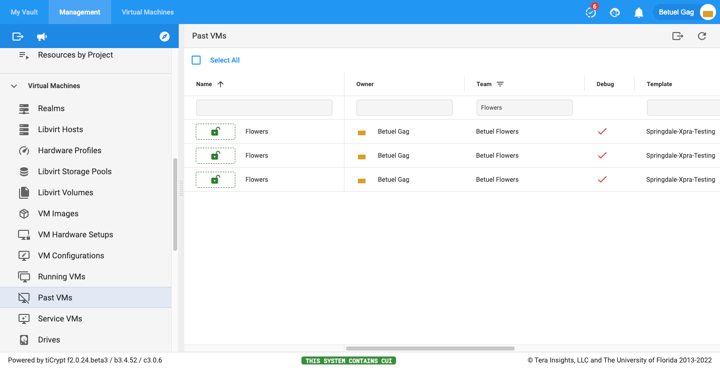 The virtual machines tab allows users to view the virtual machines that are running in the system along with the owner, the team that is associated to the VM, whether it is a debug machine, the brick (the word used in this case is template), the cores, and the memory. If no VM's are running, nothing will appear in this tab.