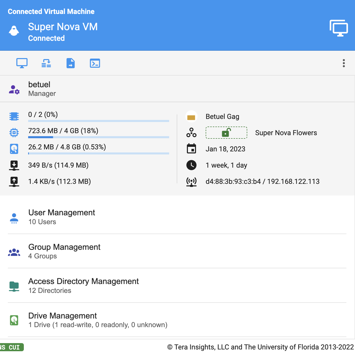In this section you can view your profile in terms of this virtual machine. This includes basic information such as your role, permissions, your access directories, and groups. Note that nothing can be changed here, only viewed. Profile changes and roles are managed by admins.