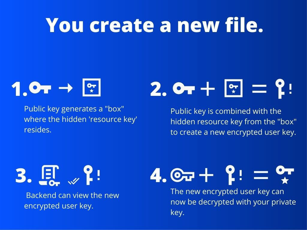 - When you create a new file, your 'public key' makes a "box" where the hidden 'resource key' resides.