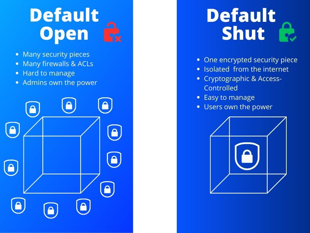 A default shut system protects its territory starting from the inside. For example, using PKC (publick key cryptography) and end-to-end encrypted software is a shut system practice.