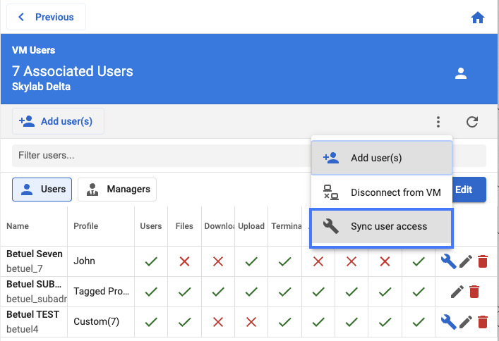 To automatically solve a permission issue between the server and your VM, you can use the Sync User Access option.