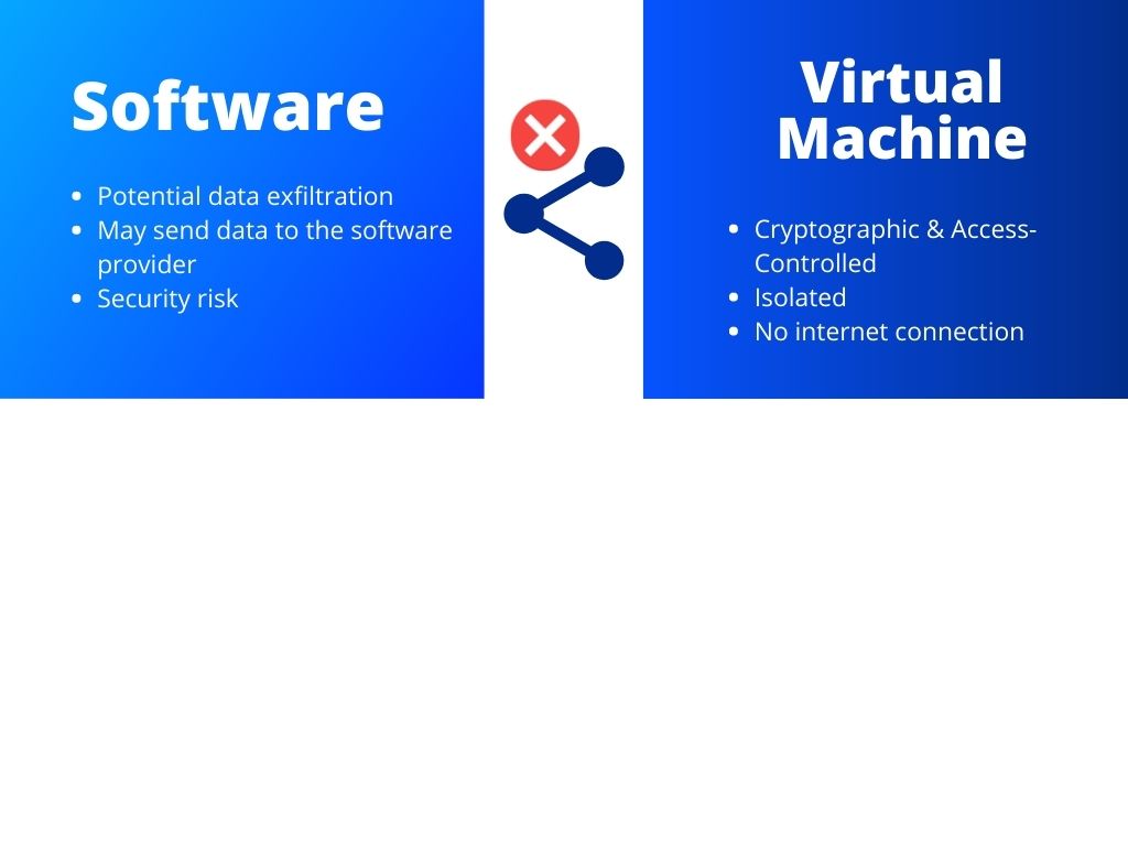 Supposedly, you acquired some software, and it runs well on your VMs, but the software "calls home" and reports information about you. In this case, a hacker may easily find a way into your virtual machine putting your work at risk.